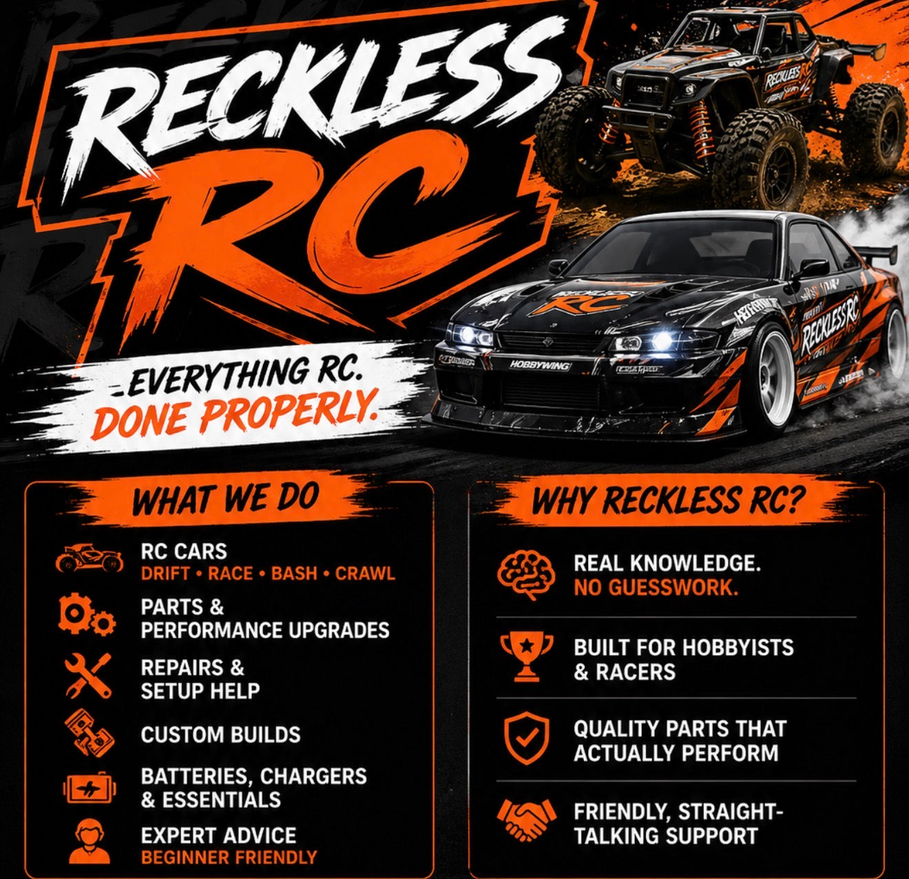 At Reckless RC, we're passionate about remote control vehicles and the hobby that drives them. We stock everything you need to build, upgrade, and race your RC collection — from high-performance cars and engines to batteries, bodyshells, wheels, and tyres. Whether you're a seasoned racer or just getting started, you'll find quality parts and vehicles sourced for enthusiasts who demand reliability and performance. Browse our full range and join a community that takes RC seriously.