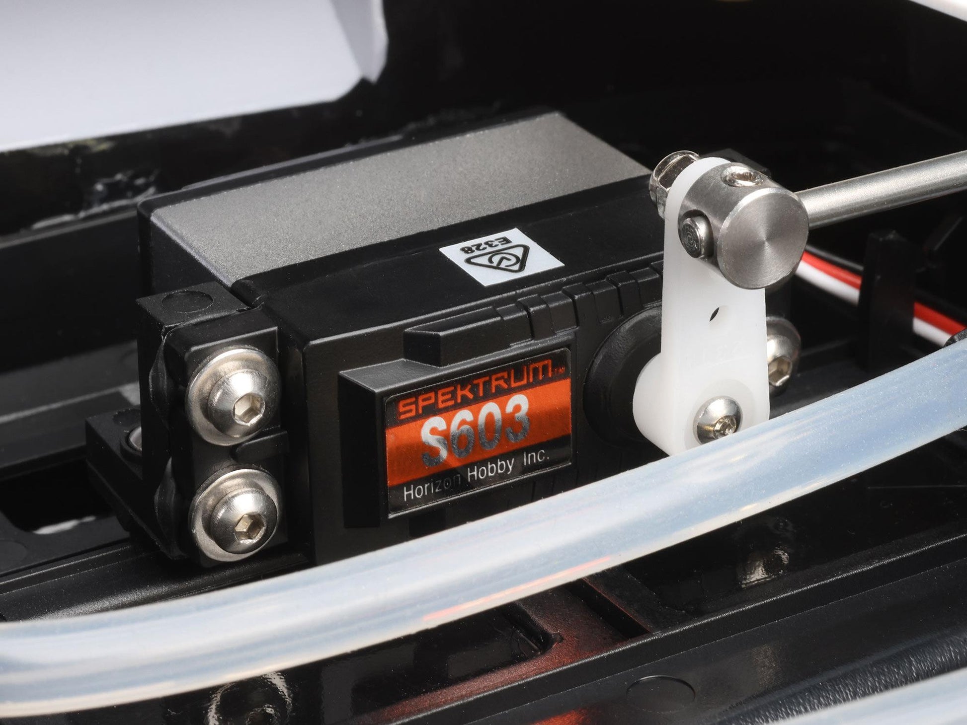 Other additions include the innovative Pro Boat SSL (Strap, Slide, Lock) battery tray that eliminates the hassle from locking down batteries in confined spaces. You can swap out packs in a snap - it takes only a matter of seconds. Bushing lubrication is simplified with a "grease and go" system that reduces this task to just three easy steps: remove the prop strut plug screw, pump in some grease, and seal it back up. The grease passes through the prop strut and stuffing tube into the bushing, right where it's needed.
