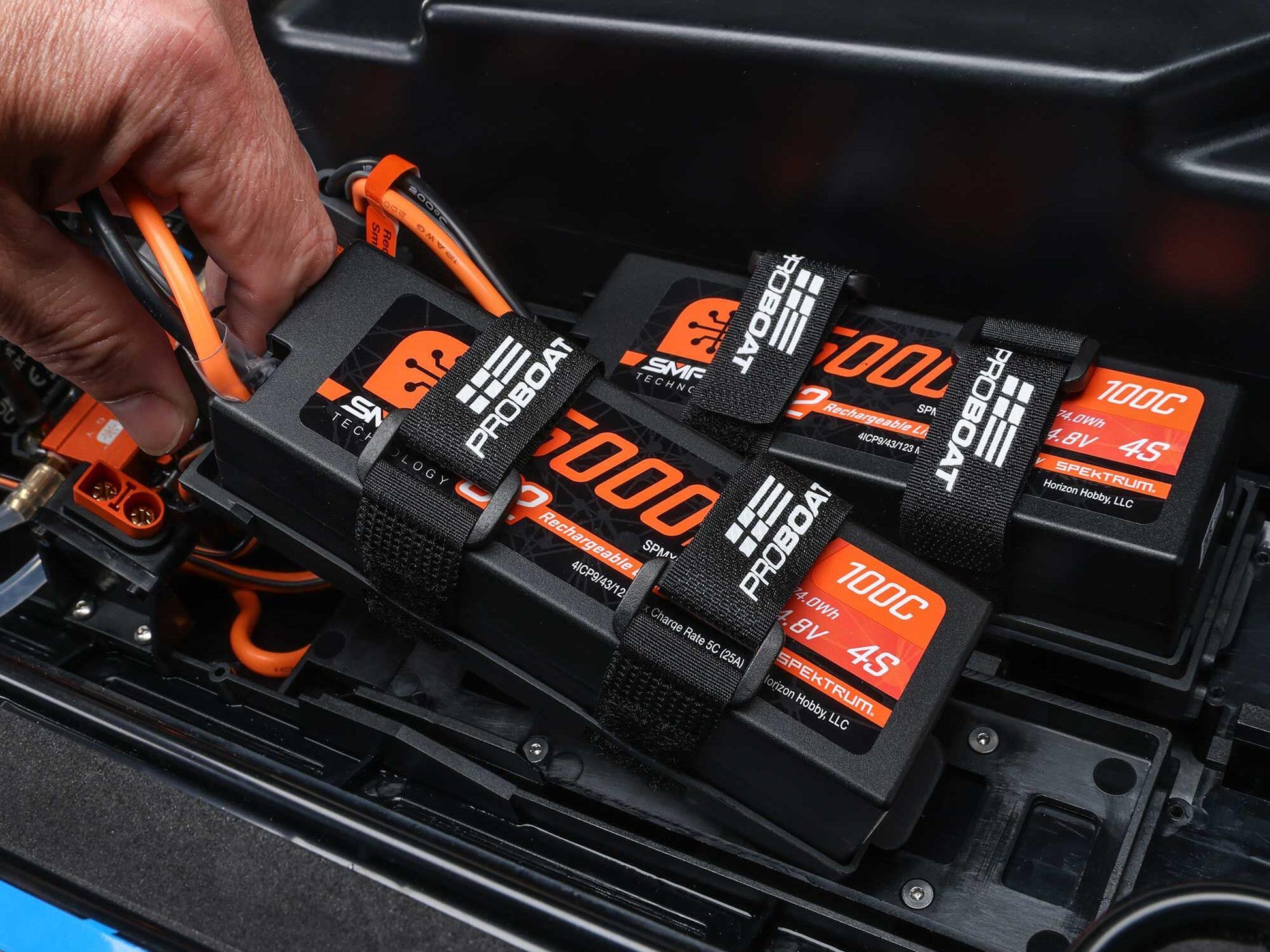 The Super Sonicwake 48" has a factory-installed Spektrum 8S brushless power system capable of producing 50+ mph speeds. Independent water-cooling systems for the motor and ESC keep your hard-working electronics at safe operating temperatures. Depending on which recommended LiPo battery option you use, you can maximize speed or extend run time. The innovative Pro Boat SSL (Strap, Slide, Lock) battery installation system lets you exchange packs in just a matter of seconds.