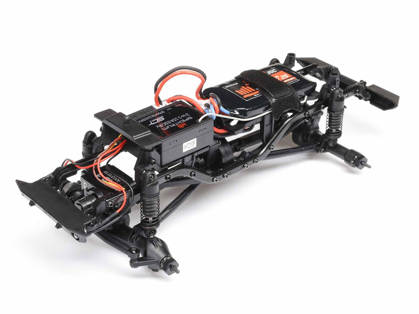 - Assembled SCX24 chassis, drivetrain, and suspension