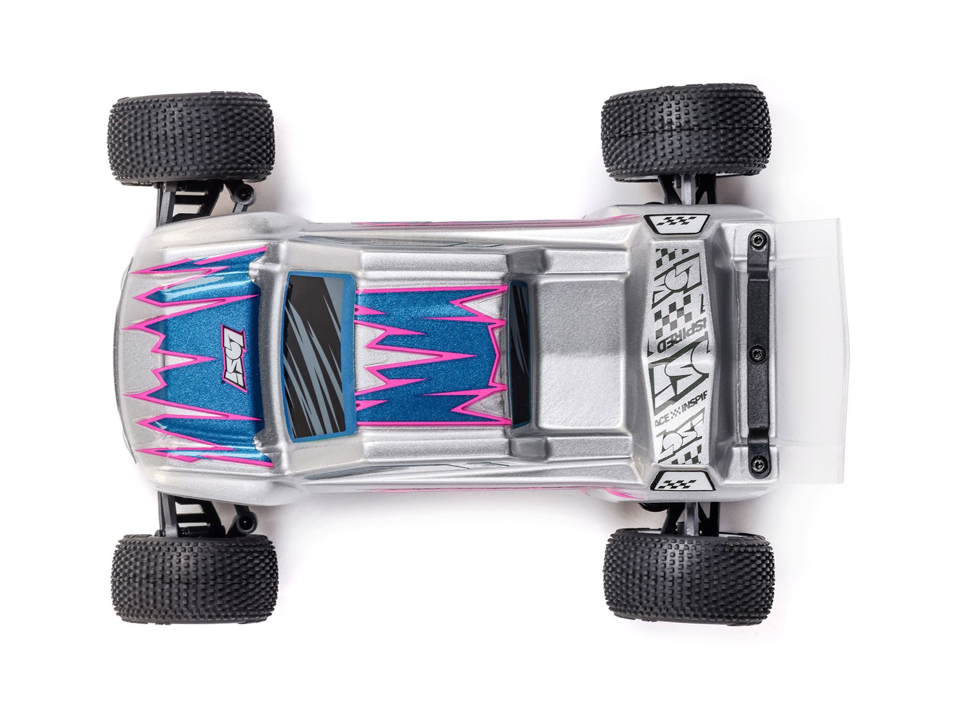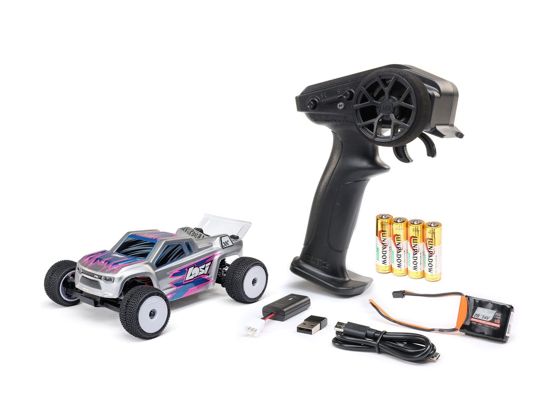 The Micro-T stadium truck can reach top speeds above 13 mph. That's absolutely insane for a vehicle of its size! But for RC newcomers who aren't quite ready for that power, the included Spektrum SLT2 transmitter has an easy-to-use, confidence-boosting "Rookie Mode". The stadium truck's speed can be limited to 50% or 75% of its full potential simply by pressing a switch on the transmitter's back. That allows young or inexperienced drivers to learn control skills safely, at their own comfortable pace.