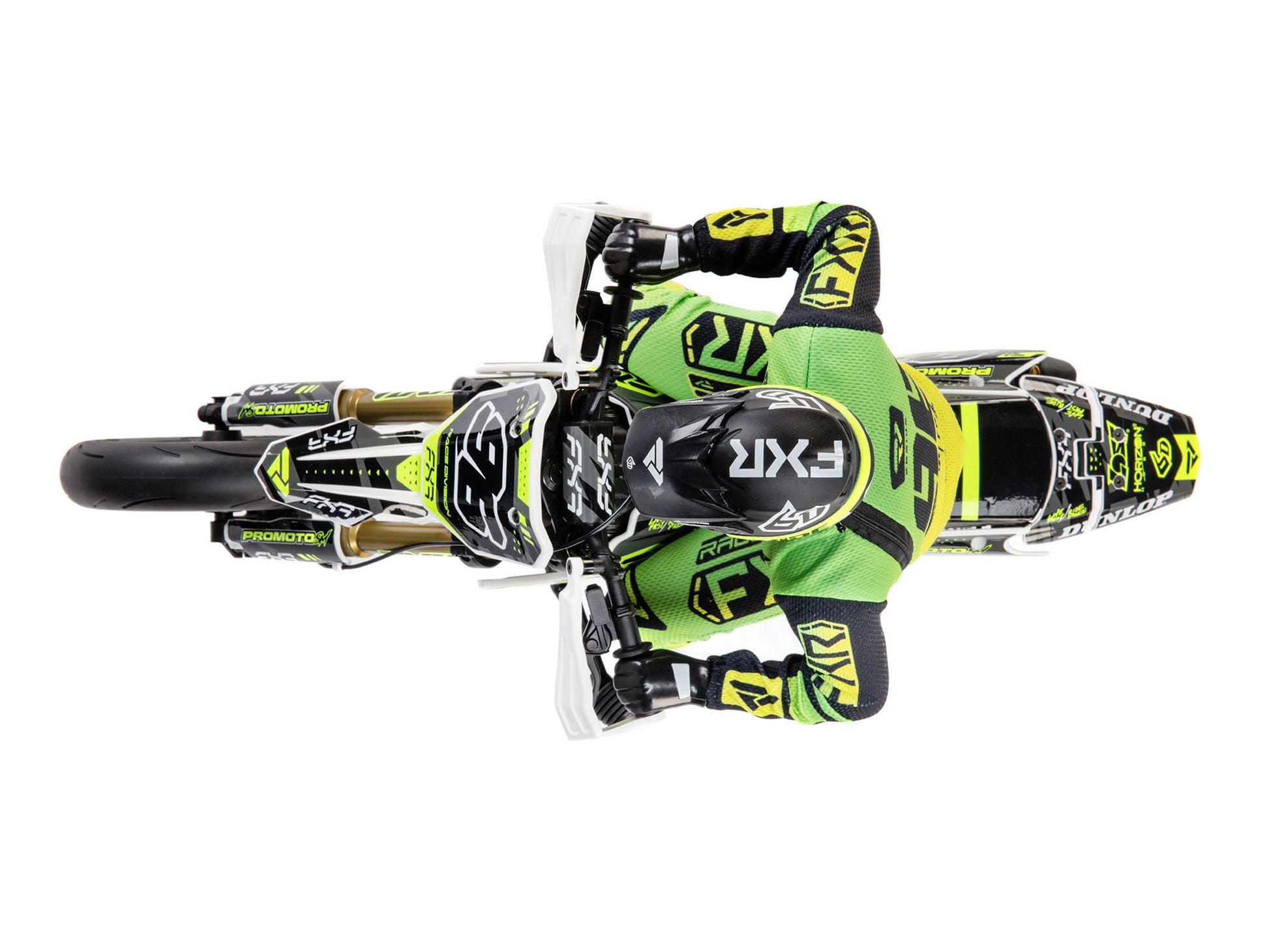 The Losi Promoto-SM also looks like a true supermoto bike. Its distinctive visual details include hand guards, shortened front fender, and officially licensed FXR graphics and rider gear.