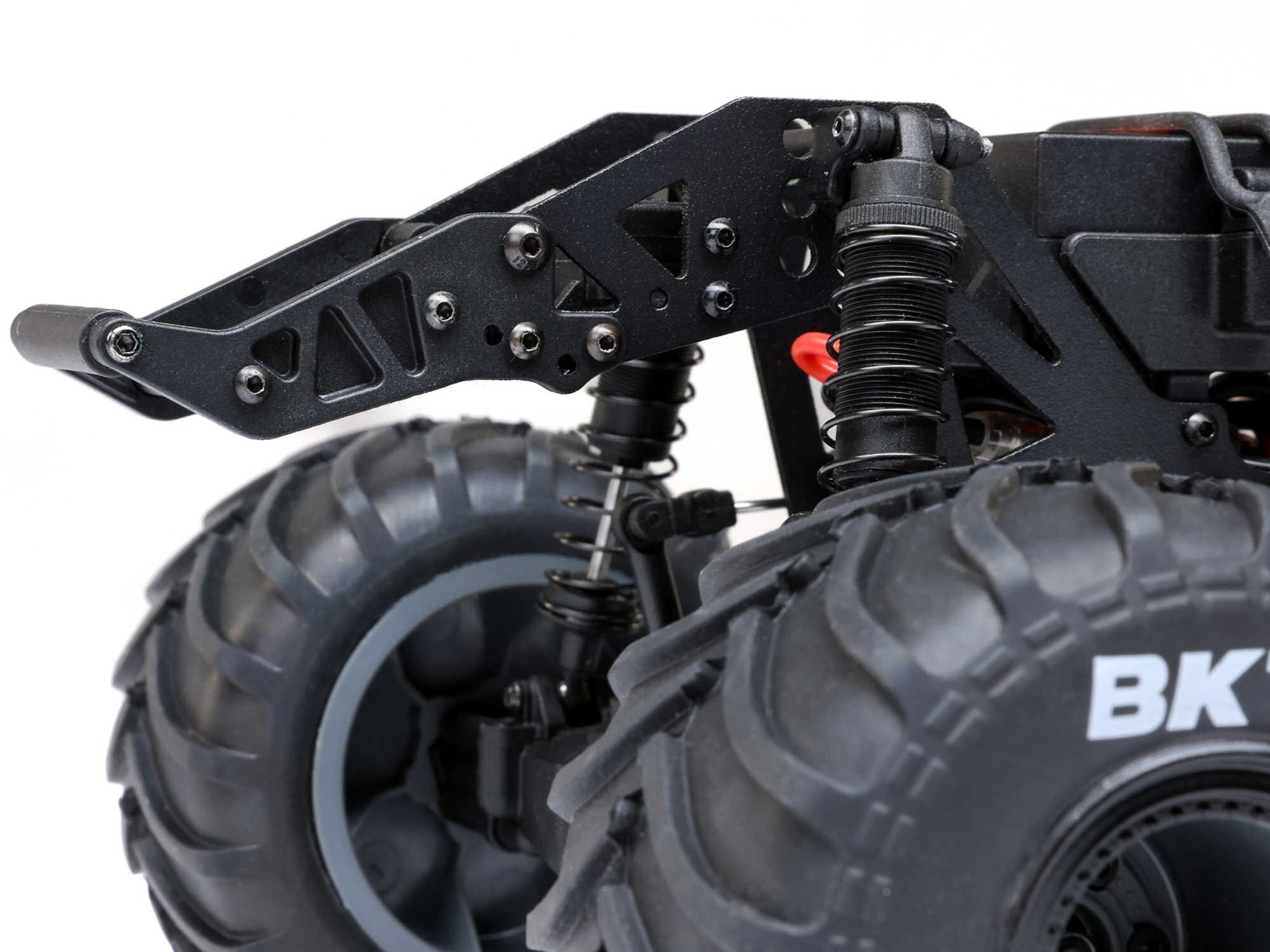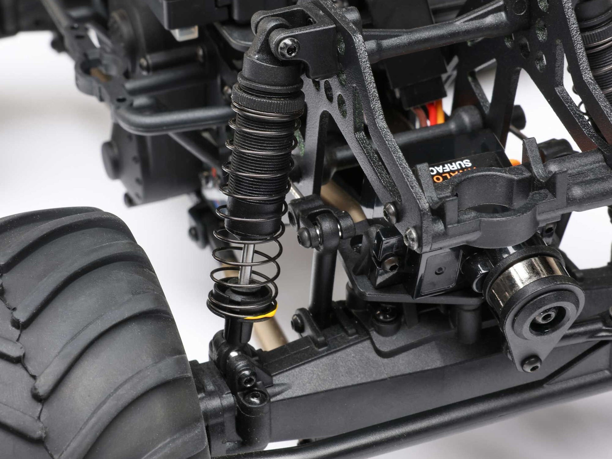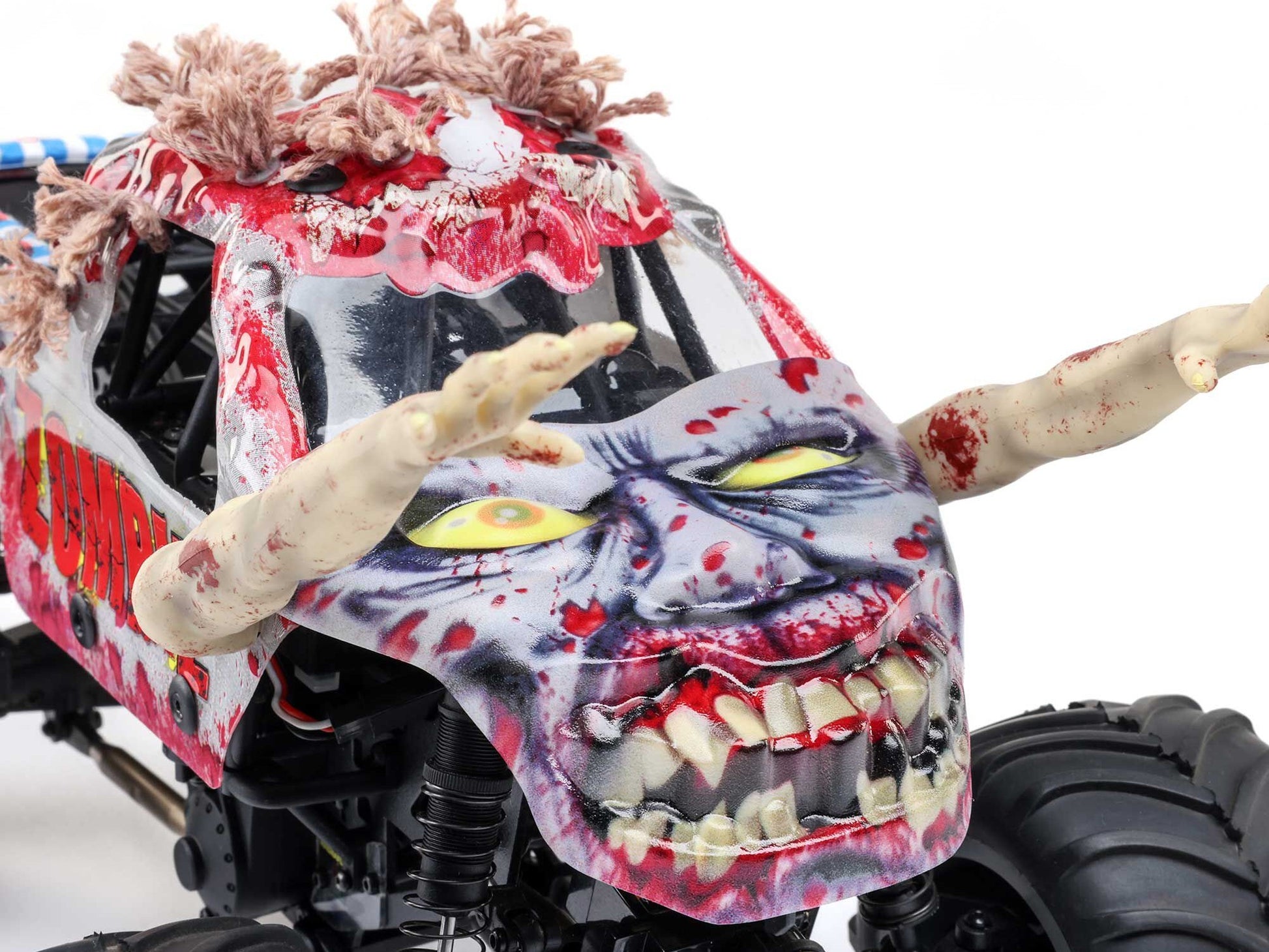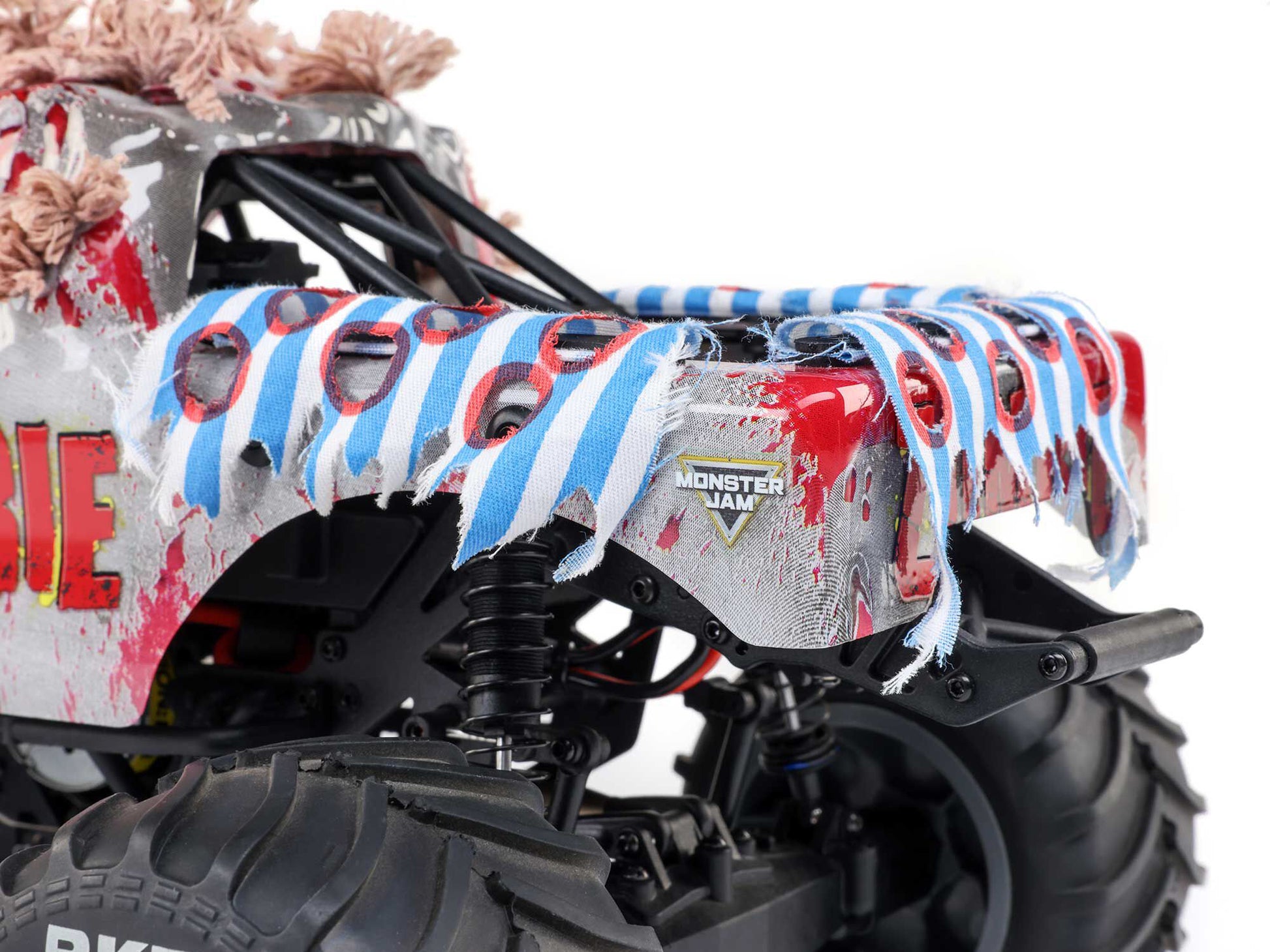 The injection moulded hood and polycarbonate cab are loaded with scale details that capture the full-scale Zombie in all its gory greatness. The eyes, teeth, and other artwork on the hood are recreated using a digital UV printing method for high-resolution accuracy. Hand-painted, flexible moulded rubber arms reach out to grab your next victim. Fourteen hair plugs adorn the roof of the cab and ragged cloth hangs from the bed, just like on the full-size truck. An all-new moulded roll cage design gives the body proper support.