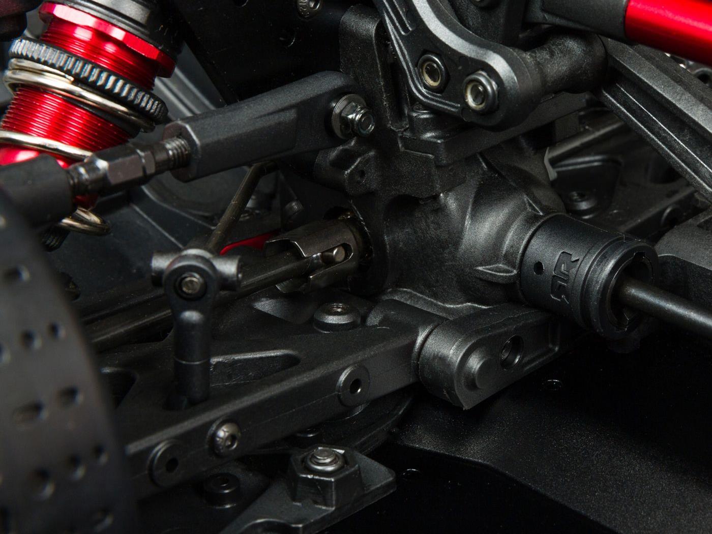 Underneath those streamlined Street Bash looks is a chassis which proves to the world, once again, that ARRMA® builds the most durable bashers. The 6061-T6 anodised aluminium chassis houses a heavy-duty drivetrain with steel driveshafts, plus all-metal diff outdrives and gearbox internals. Updated internal gears feature a new tooth profile for increased strength. A lower internal gear ratio reduces the center line transmission RPM, reducing the center drive shaft resonance and increasing drivetrain durability. Chassis toughness is reinforced with a center brace. Bearings are rubber-shielded, and the adjustable, oil-filled, anodised aluminium shocks are mounted on strong, black-anodised aluminium shock towers.