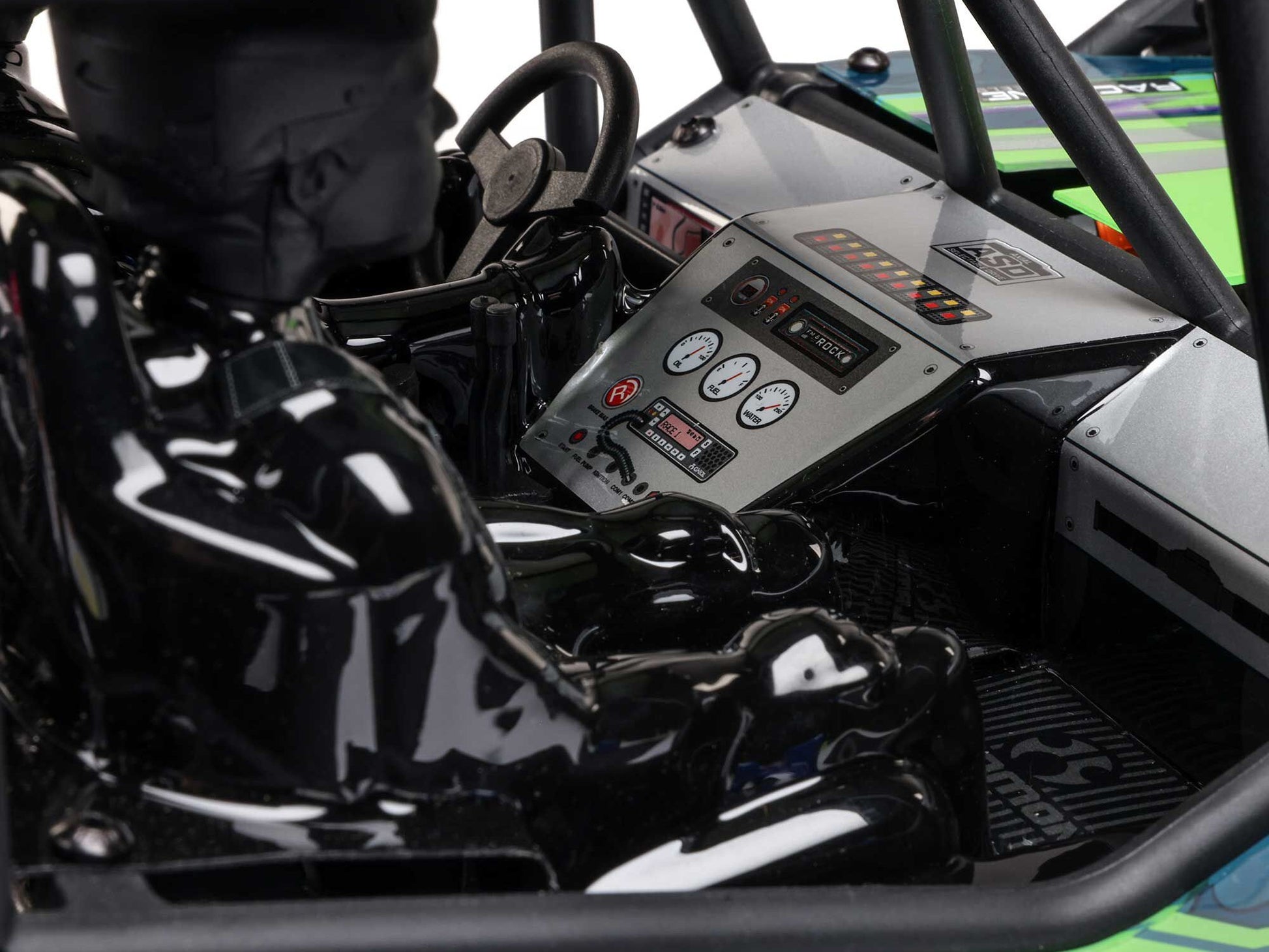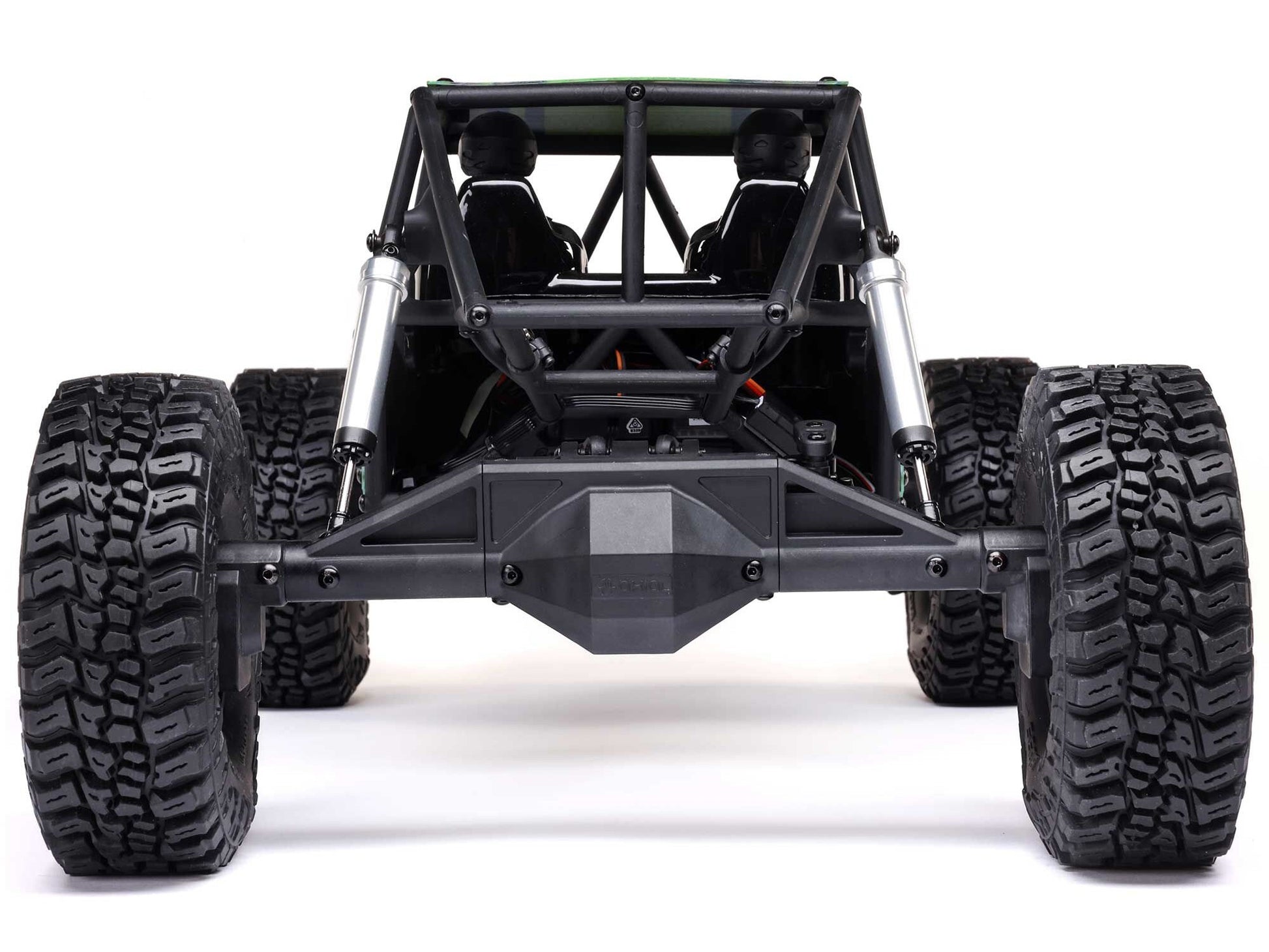 Further improving the rig’s trail performance are the extreme articulation of its 4-link suspension and the additional clearance of its realistic, new IS10 internal spring shocks. An oversized, high torque Axial Boulder 550 21-turn brushed motor sends power through durable, heavy-duty WB12 driveshafts to officially licensed Raceline Avenger wheels and 5.5-inch tall Mickey Thompson Baja Boss M/T tyres. Surrounding it all is a durable composite cage that offers protection and challenge-ready trail buggy looks.