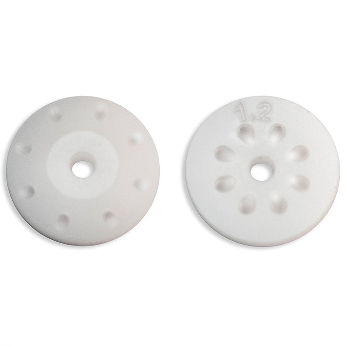 The tapered profile and angled holes of these new shock pistons improve handling through bumps and make the car jump flatter and land better. The angled holes allow you to run lower oil weights to generate more grip.