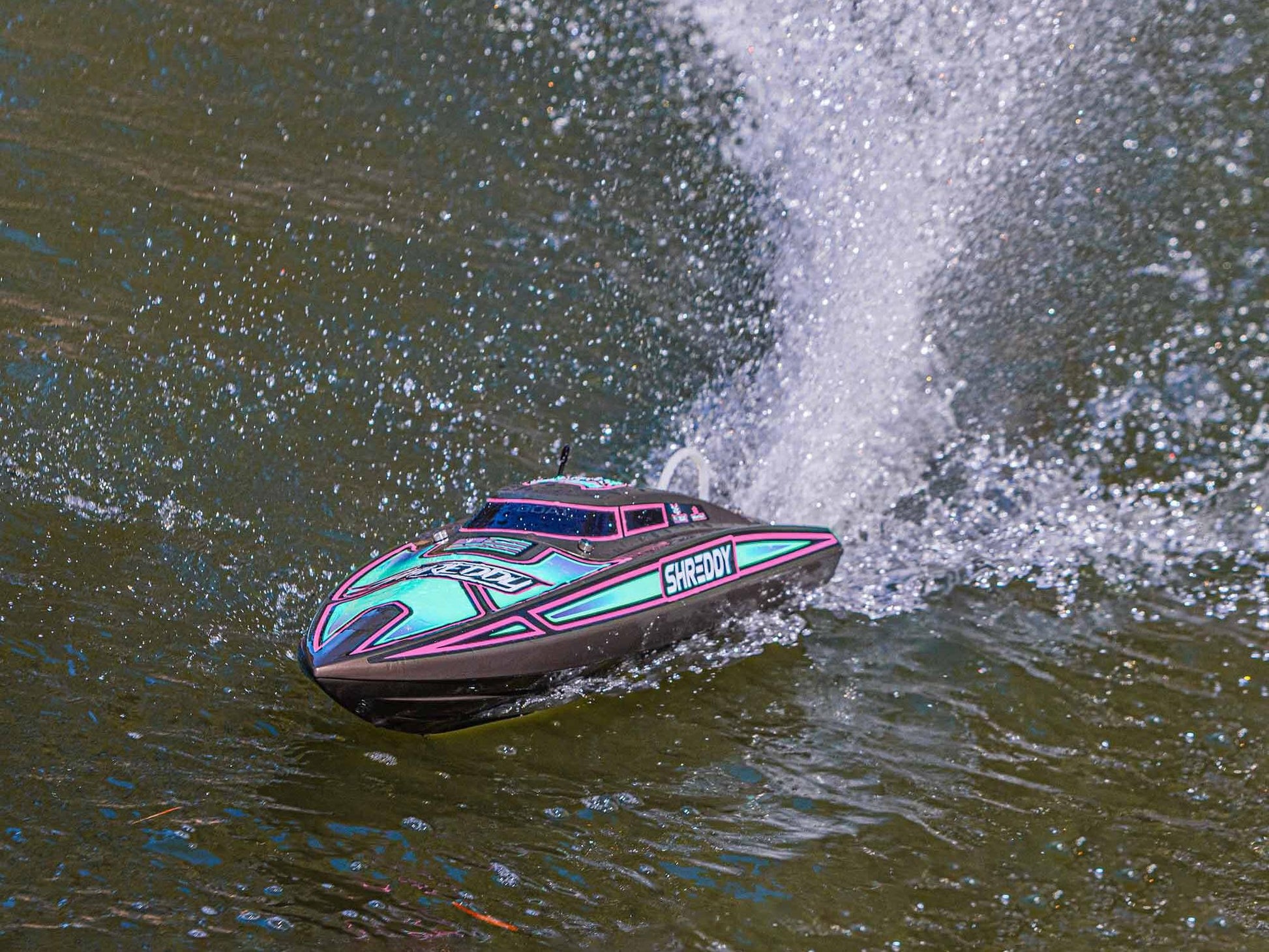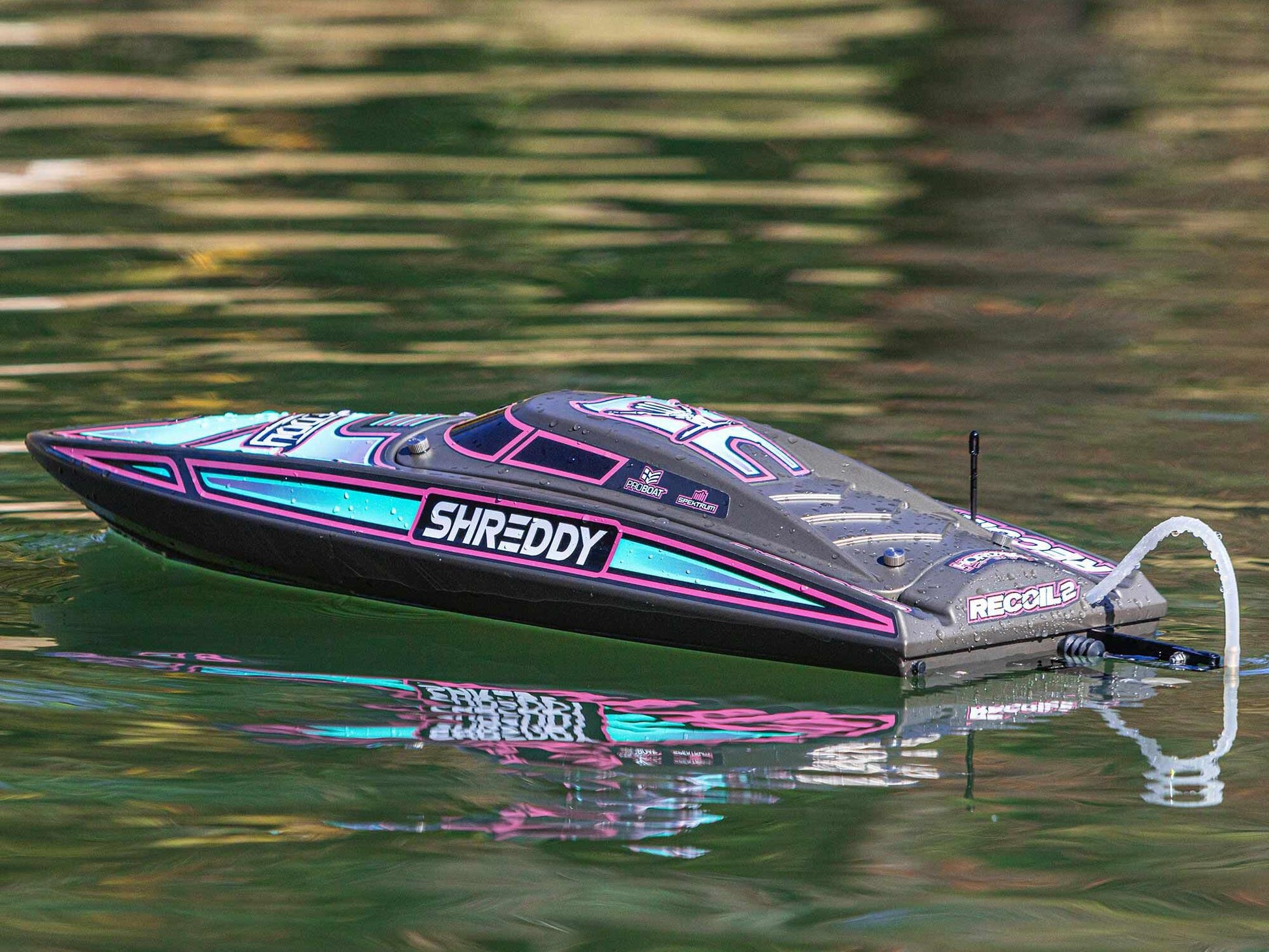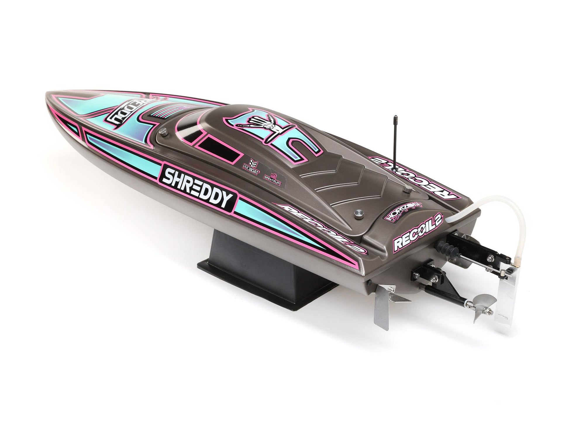 The Recoil 2 V2 also features a strikingly finished, high-impact ABS moulded hull and canopy with aluminium thumb screw canopy locks, durable modular interior, and aluminium offset rudder and propeller strut. With its technological advances, ready-to-run simplicity, custom Heat Wave Visual or Shreddy liveries, and worry-free self-righting, the 26-inch Pro Boat Recoil 2 V2 deep-V makes it easier than ever to own the lake!