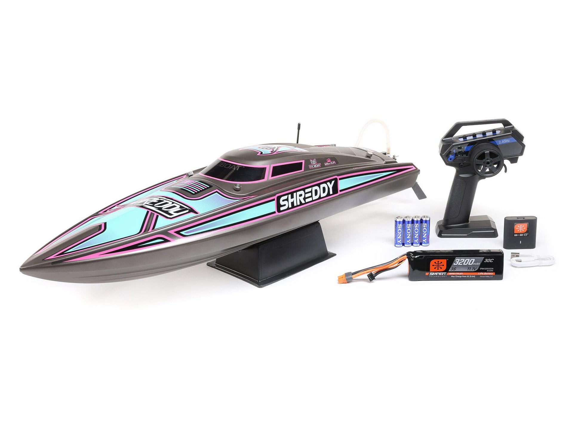 Everything you need is in the box. The Spektrum SLT3 2.4GHz radio system combines standard-setting dependability with the functionality and ergonomics needed to enjoy every moment of your time at the lake. The Smart 3S 3200mAh battery and S120 USB Smart Charger are ideal for newcomers to the hobby. The charger can use any USB port for power, providing a versatile charging solution for every boater. Even a boat stand and AA transmitter batteries are supplied.