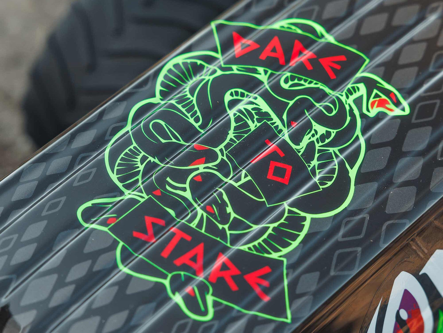 No options are needed for the GORGON MT to make you the centre of attention from the start. Straight out of the box, its strikingly original looks draw a crowd. The body comes factory-finished in your choice of red or fluorescent yellow, with colour-coordinated shock springs, battery tray, skid plates, and front and rear bumpers that resist impacts and help protect those "fang-tastic" graphics.