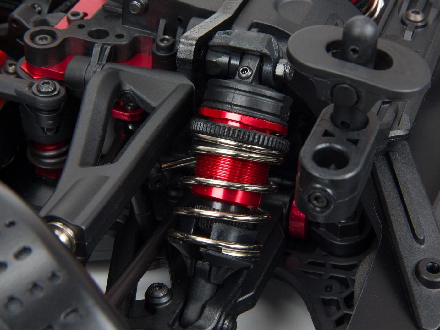 Underneath those streamlined Street Bash looks is a chassis which proves to the world, once again, that ARRMA® builds the most durable bashers. The 6061-T6 anodised aluminium chassis houses a heavy-duty drivetrain with steel driveshafts plus all-metal diff outdrives and gearbox internals. Its toughness is reinforced with a center chassis brace. The adjustable, oil-filled, anodised aluminium shocks are mounted on strong, black-anodised aluminium shock towers. Push the throttle to the max — the FELONY™ 6S BLX Street Bash RTR is made to take it.