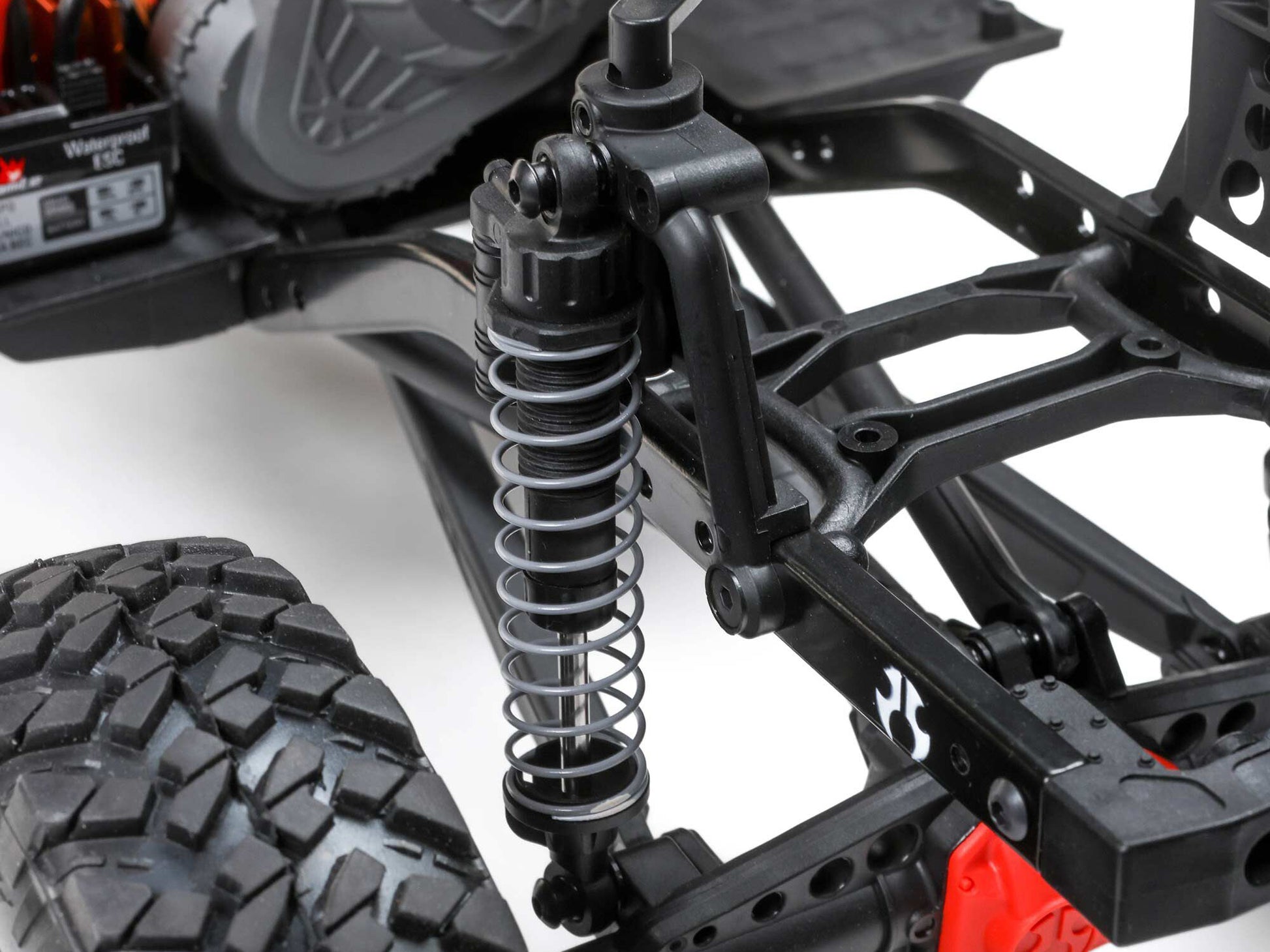 Just as a full-size truck has its steering box located on the frame, Axial® places the Deadbolt's adjustable servo mount on the SCX10 II chassis frame and allows a wide range of servos to be used. Universal joint axles permit up to 45° of steering and provide an efficient, high-performance drivetrain. The single-piece AR44™ front and rear axles feature a moulded truss for extreme durability. The pinion gear is 6mm above centre for higher ground clearance and improved driveshaft angles. Metal dog bones and helical cut internal gears are standard equipment, and the drivetrain includes full, high-quality ball bearings.