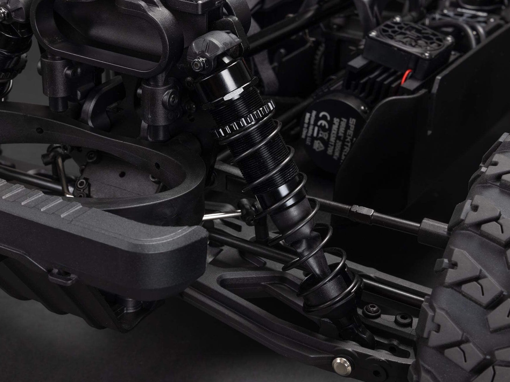 From the reinforced, black-anodized 6061-T6 aluminium chassis to the independent suspension with adjustable, aluminium-bodied, oil-filled shocks, the characteristically durable ARRMA design lets you fearlessly tackle all terrain and all conditions. The metal drivetrain, steel driveshafts, and metal-geared Spektrum S665 digital steering servo all work together to bring out the full bashing potential of 6S brushless power.