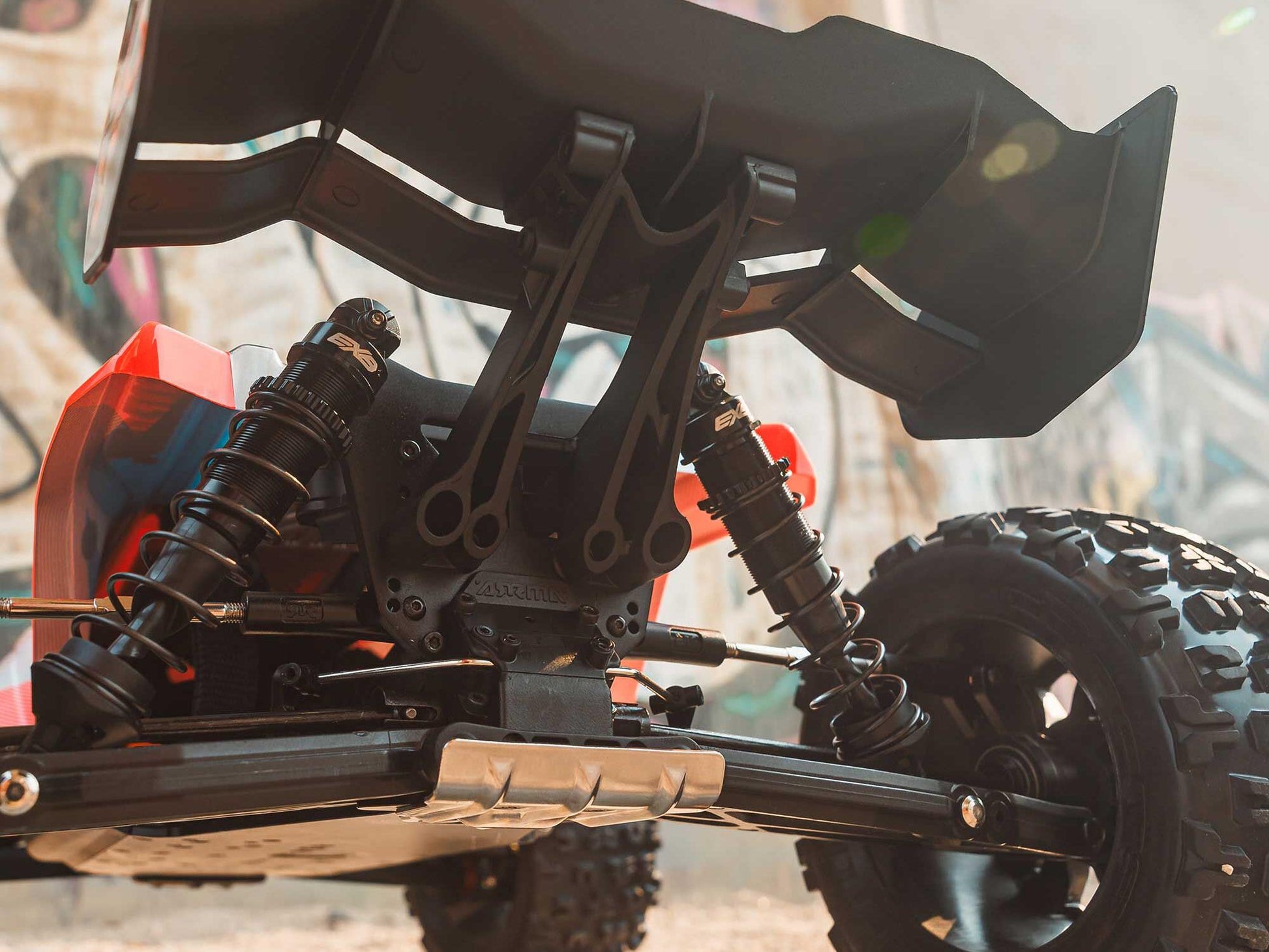 The chassis plate, differentials, front bumper, skid plate, and even the wing mount have all been improved with EXB (Extreme Bash) toughness. New side guards, a two-piece tower-to-tower brace, and inner body tower add more strength and simplify maintenance. The iconic KRATON monster truck body now comes in two striking new multi-colour factory finishes, and has a convenient, quick-release, clipless body retention system.